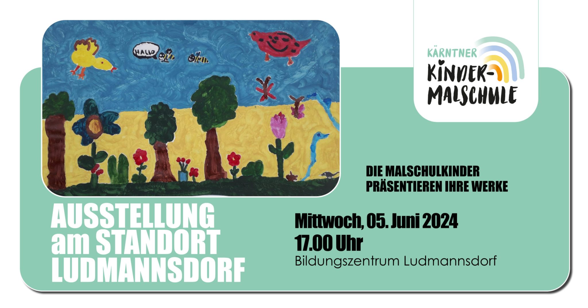An allen 12 Standorten präsentieren die Malschulkinder am Ende des Frühjahrsemesters eine Auswahl ihrer Werke. Am Standort Ludmannsdorf findet die Ausstellung an folgendem Termin statt: