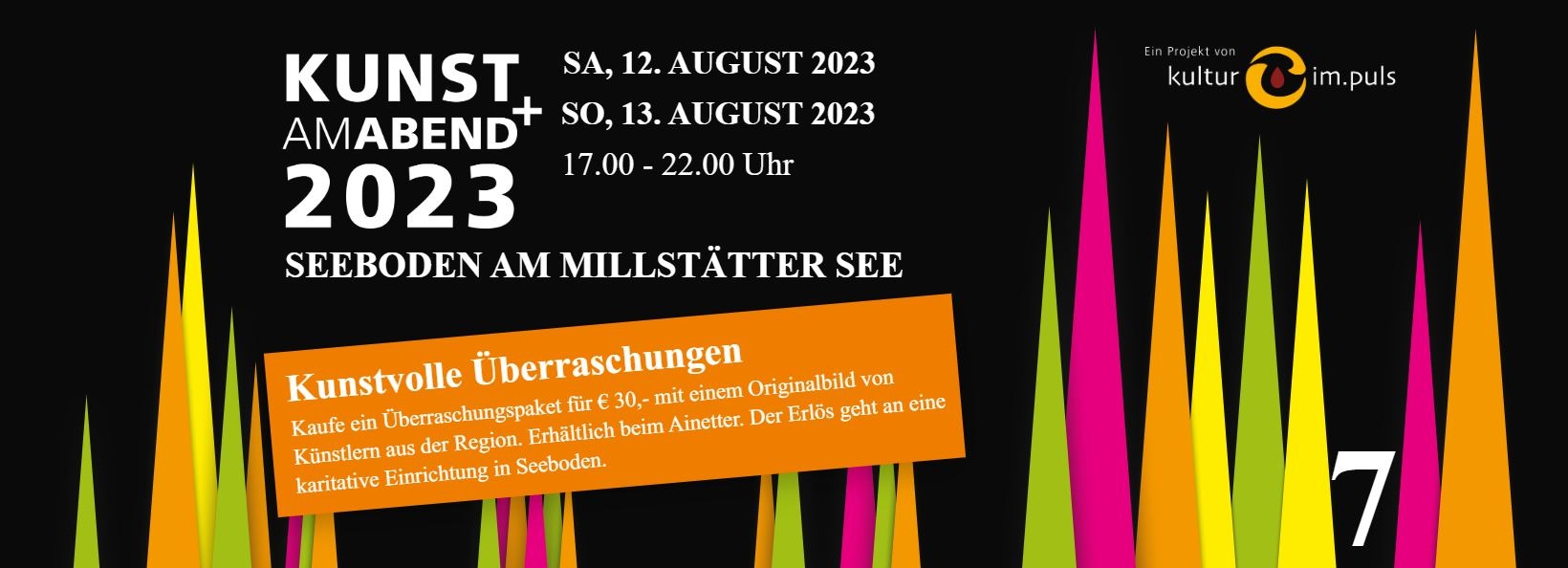 Einmal im Jahr wird am Abend die Marktgemeinde Seeboden zur offenen Galerie und zieht zahlreiche Besucher auch aus dem Umland an. Ziel dieses Projekts ist es, der Bevölkerung und den Gästen einen zwanglosen Zugang zu allen Spektren des Kunstschaffens zu ermöglichen. Eingebunden in dieses Projekt sind unsere „Gastgeber“, zu denen die Marktgemeinde Seeboden, örtliche Hotels und Gasthöfe und zahlreiche Institutionen und Betriebe gehören, die uns für diesen Abend Räume zur Verfügung stellen.