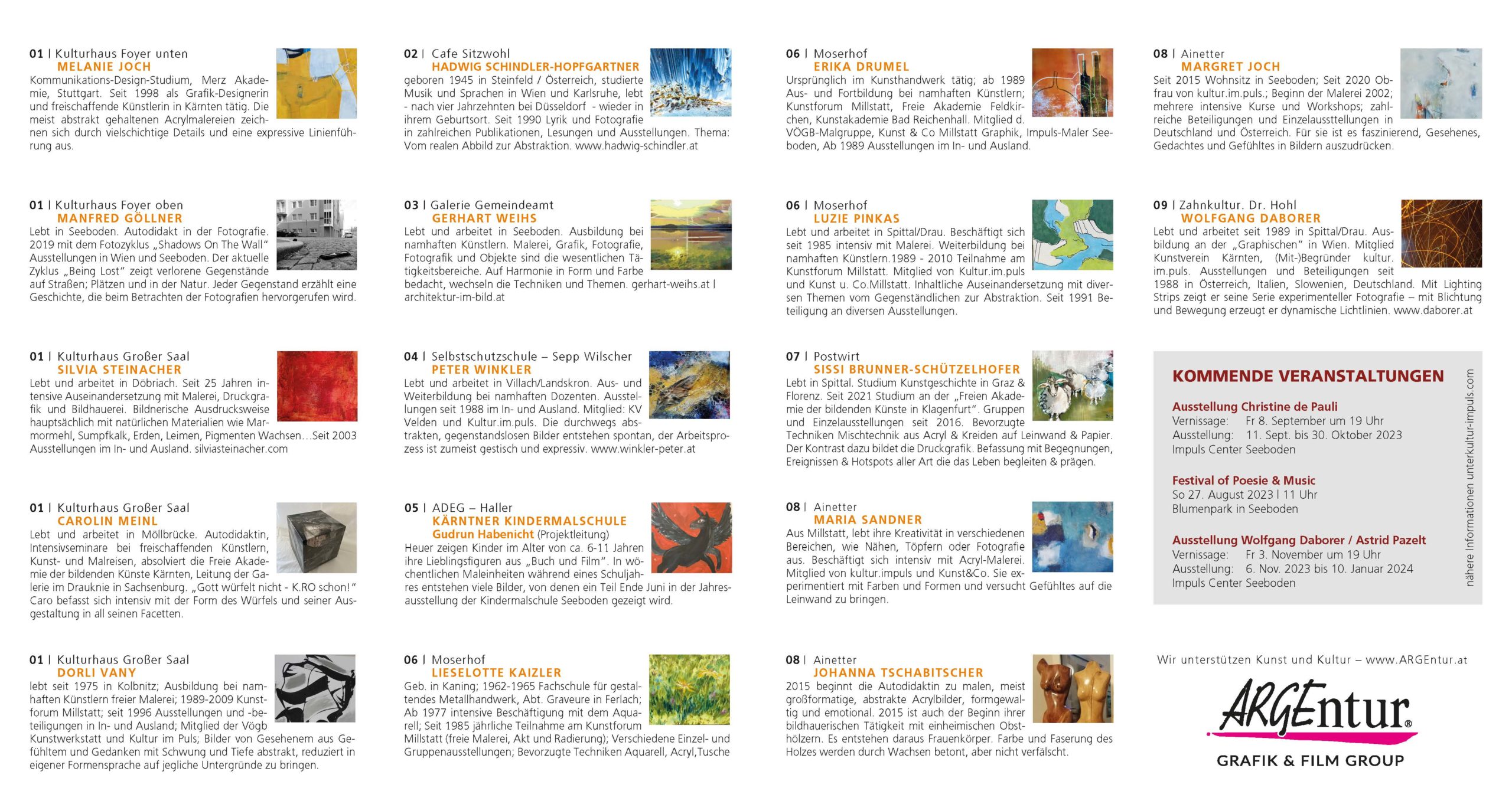Auch in diesem Jahr gibt es wieder die Gelegenheit, sich Zeit zu nehmen, um zu schauen. 16 Aussteller:innen bespielen an 9 verschiedenen Orten das Zentrum von Seeboden. Gezeigt werden Malerei, Skulpturen, Fotografien, Zeichnungen und Installationen – und mittendrin der Standort Seeboden der Kärntner Kindermalschule!